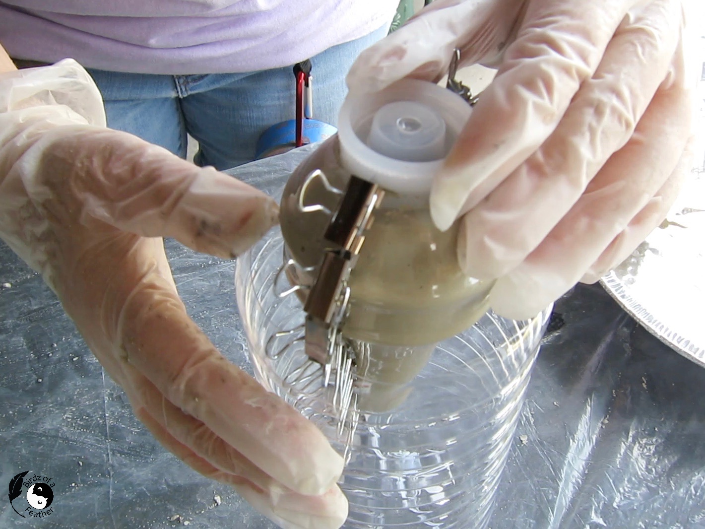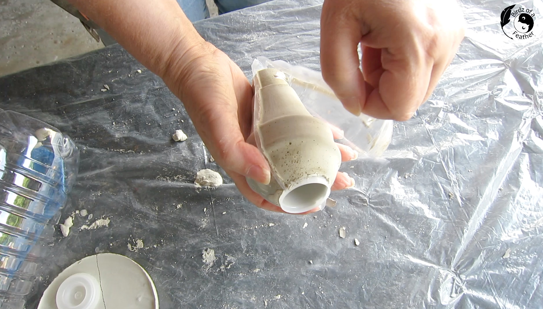 Pour the cement into the makeshift plastic bottle funnel.