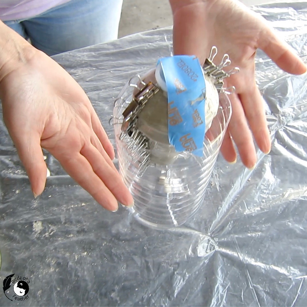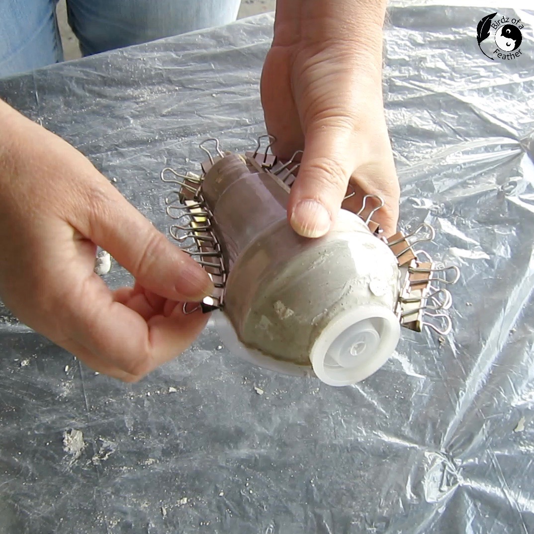 To seal the cement planter mold and prevent leaks, secure all sides of the light bulb packaging with binder clips.
