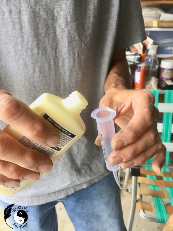 Now’s the time to add some wood glue before inserting the screw. A glue syringe and some painters tape is essential for this step. We use Lepage Quick Dry Glue for this step.