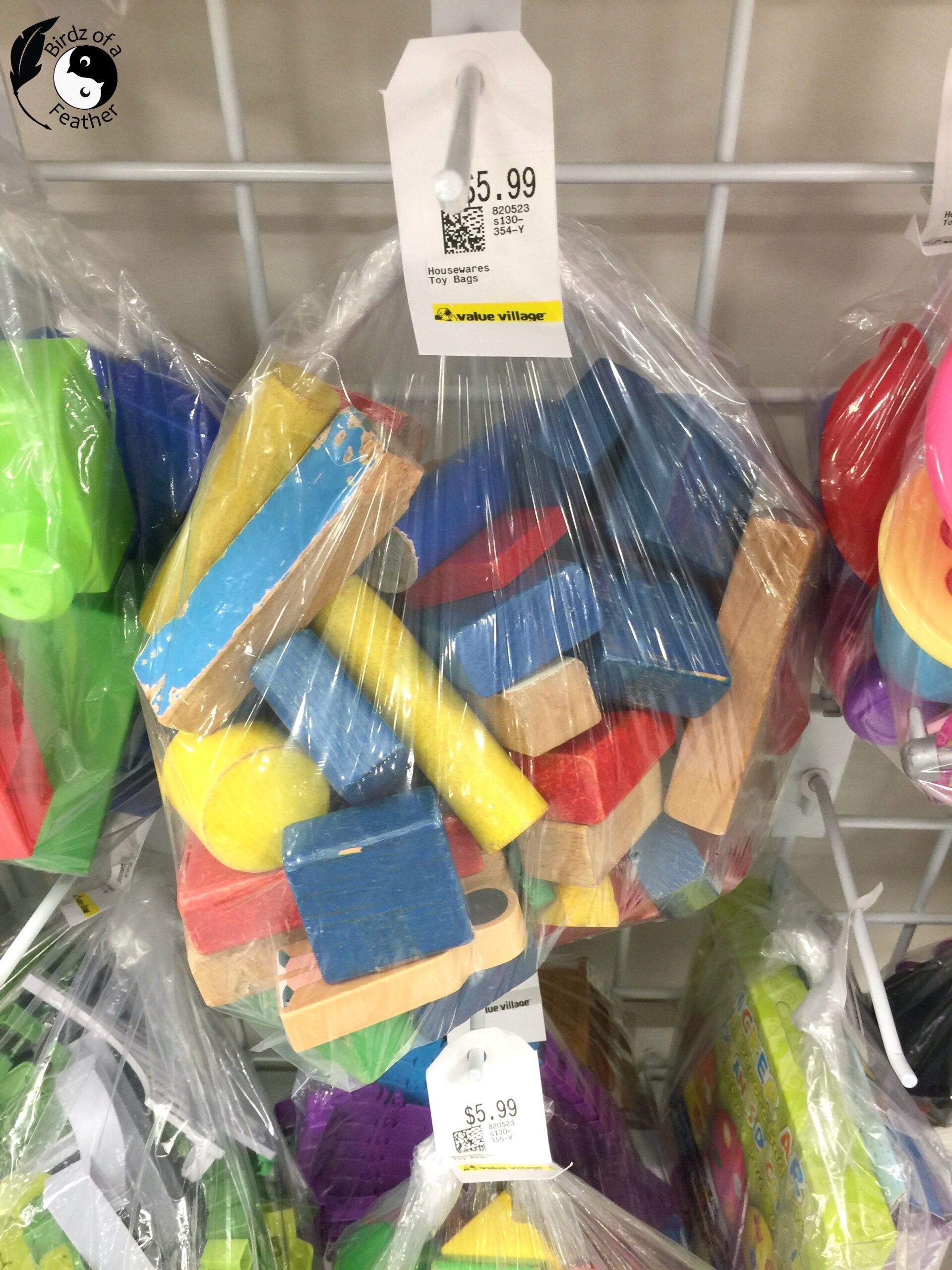 We always see bags of kids’ blocks at the thrift store. Or you can cut your own out of scrap wood.