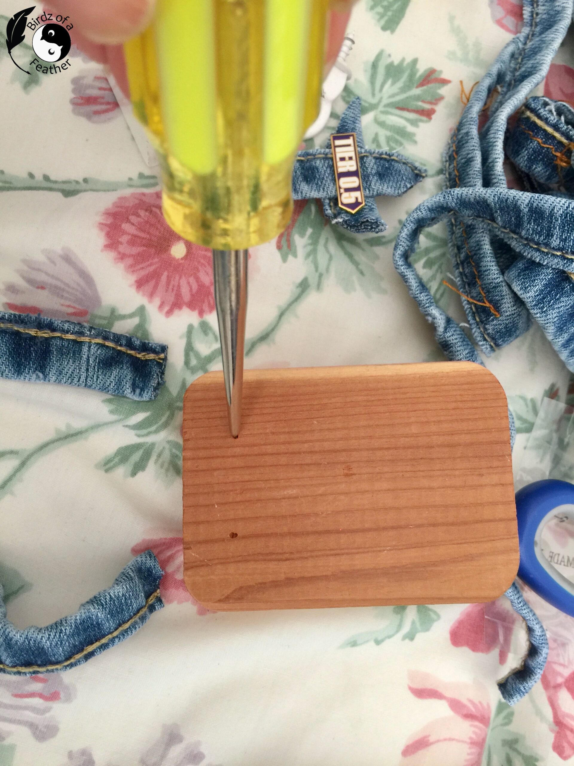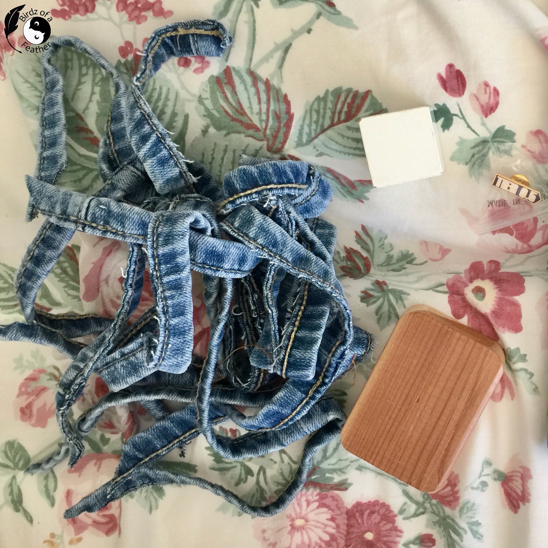 If you are vertically challenged like me, chances are you’ve shortened a pair of jeans or two. Save those hem cutoffs as the jumping off point for this cute home decor piece.