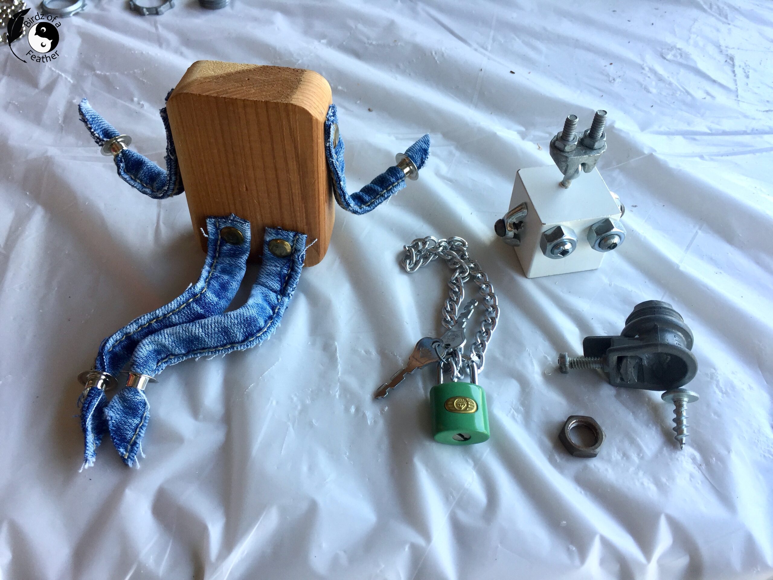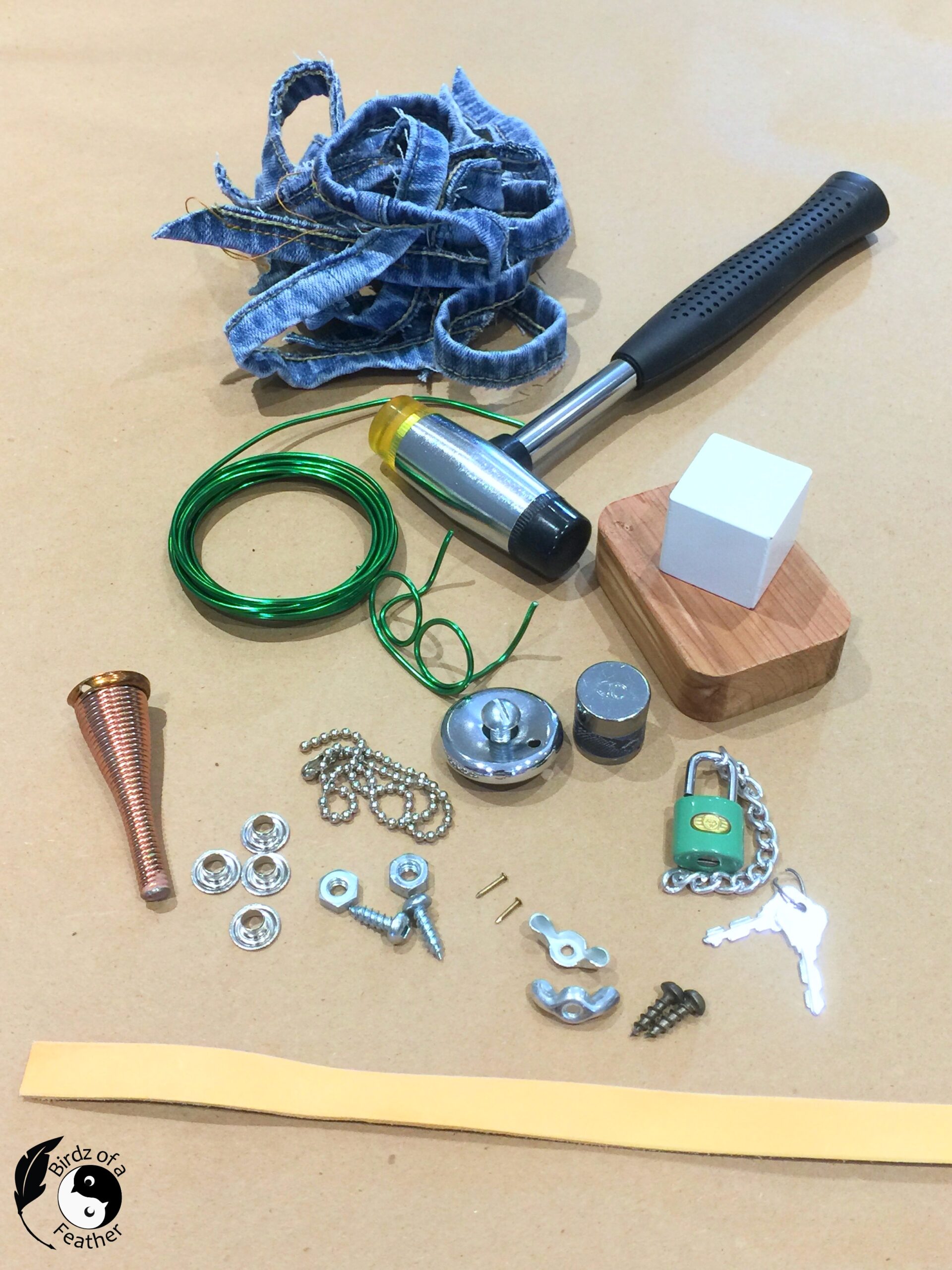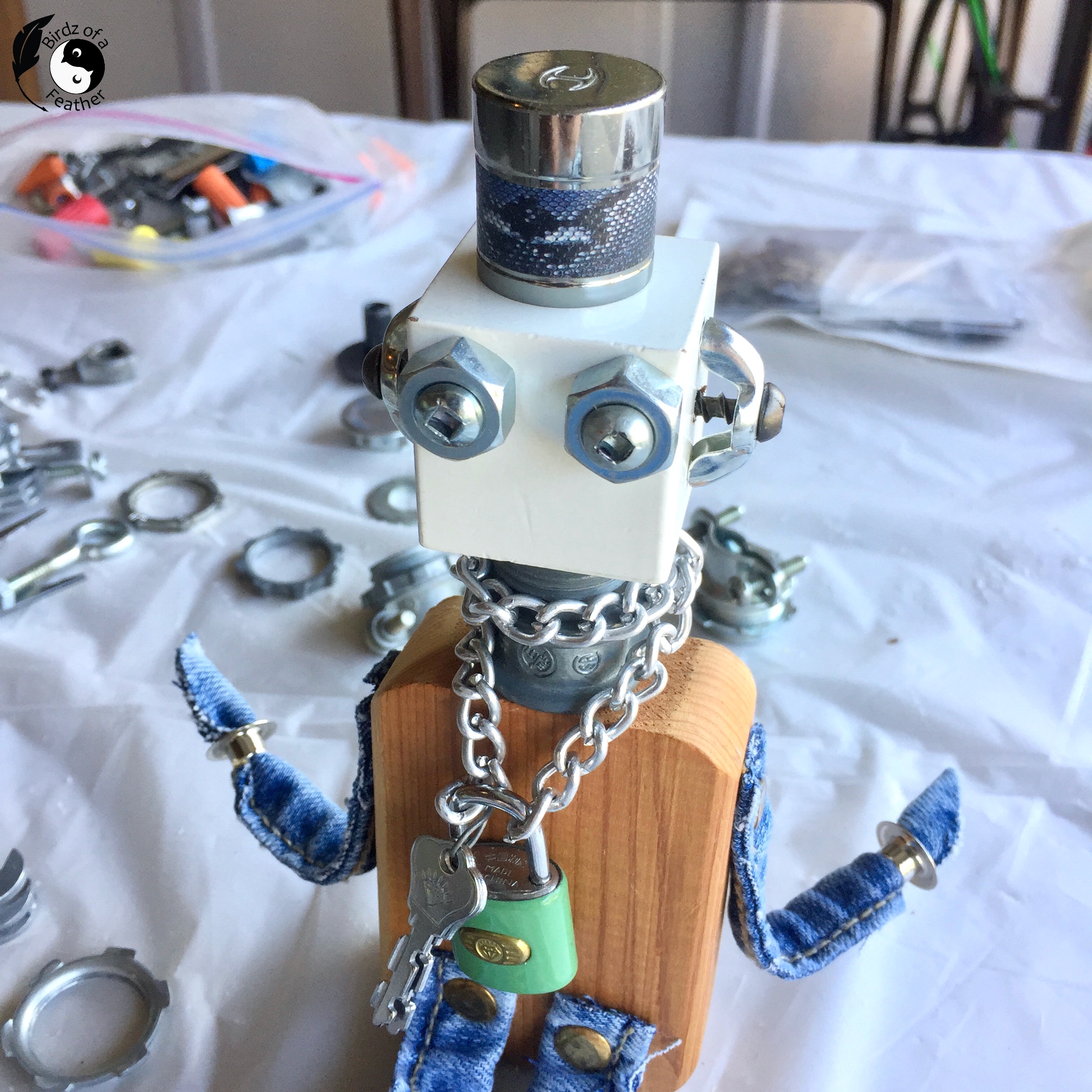 Now, let’s get crafting! First, raid your closet for worn jeans you can cut the hems or seams from. then raid your junk drawers for metal findings and screws. This is what we’re using to make our scrap robot: