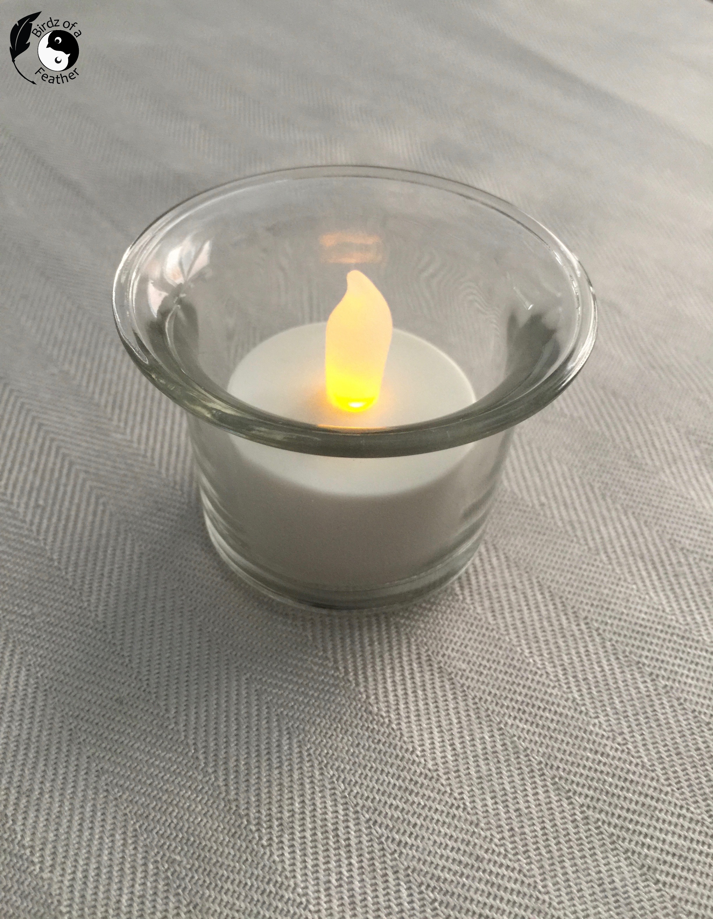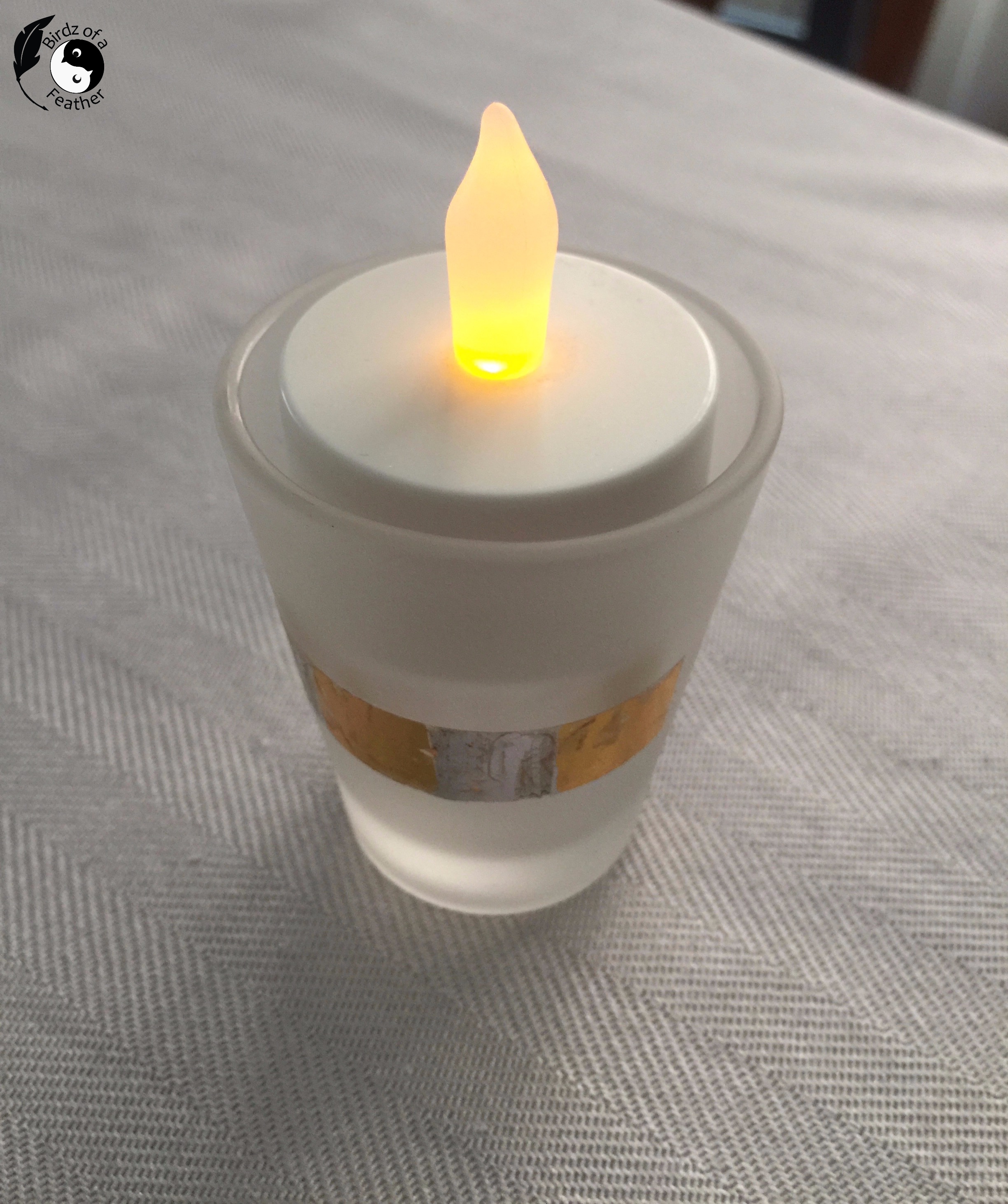 Because of the angled sides, my little shot glasses unfortunately won’t work with battery operated tea lights as you can see below. However, if you happen to be decorating clear glasses made for tea lights (shown on the right), you’re golden (so to speak!).