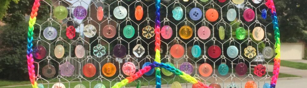 What a fun and colourful way to recycle some buttons and welcome Spring! Grab some chicken wire, a metal peace sign and some rainbow cord to make something that will look jewel-like when it catches the light!