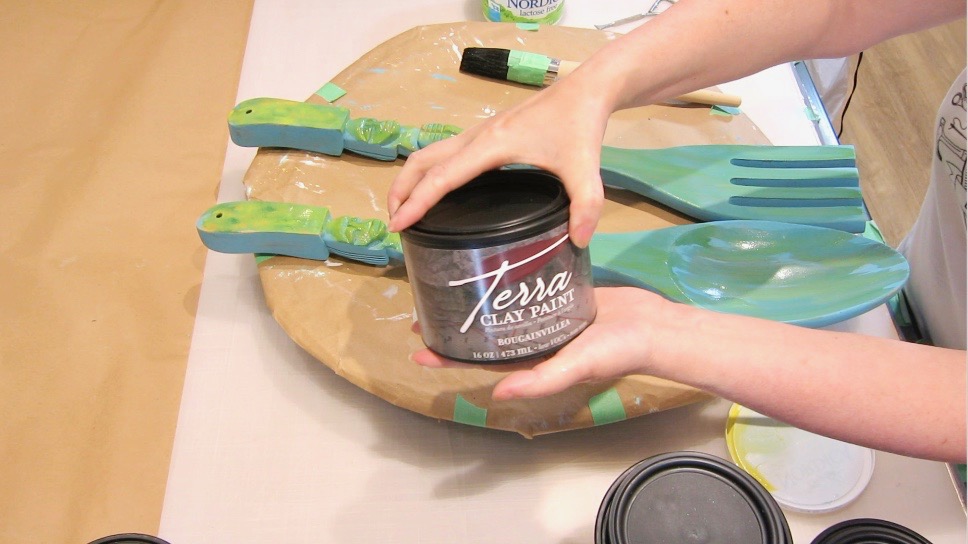 After dry brushing, I take advantage of the remaining paint in the lid and mix together water, Malachite and Daffodil for a grassy green. Terra clay paint reactivates with water so you can use every last bit if you like! That goes on in streaks on the bottom of the fork and spoon. Then I grab the Bougainvillea.