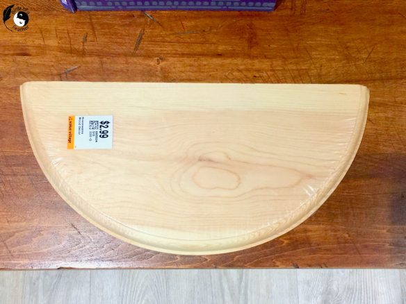 These corners shelves are a 3-shelf unit, but we’re only using one for this project. If you can’t find a similar IKEA shelf at the thrift store, cut your own out of scrap wood. These are just over 8″ along each edge. If you cut your own, you can cut them exactly to fit the width of your hard cover book (ours is almost 9″ wide).