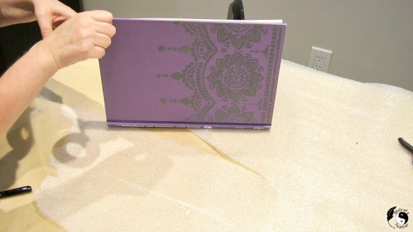 The lotus bloom stencil on the shelf is beautiful and I’m dying to try raised stencilling too. So I remove the dust jacket and stencil right onto the hard cover with black Dixie Belle Mud. It produces an awesome raised effect!