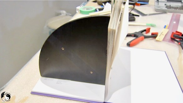Before adding screws, use a punch to remove paper from the first few pages; this allows you to ‘countersink’ the head of the screw so that it’s flush with the paper and the book covers will close flat. If you prefer, you can bring back the bookend, instead of the shelf, for this step.