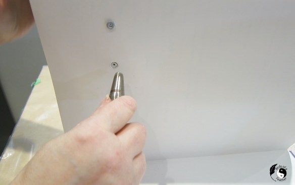 - Predrill holes the same or slightly larger than the screw shank. We originally used a smaller bit (seen below), but a larger one will allow you to tighten the screws against the shelf giving you a seamless look against the book pages.