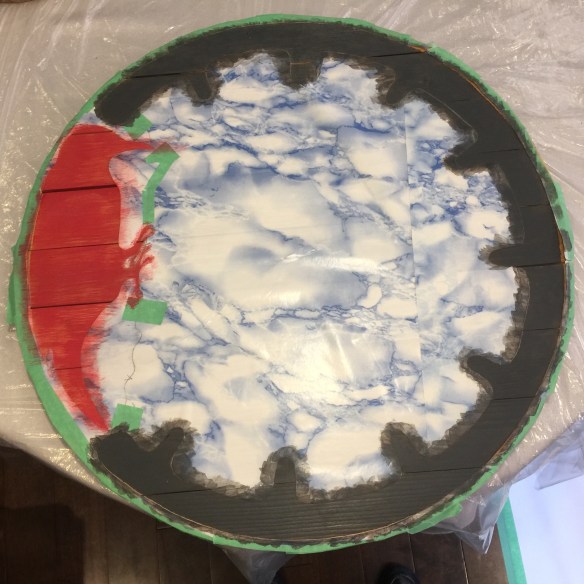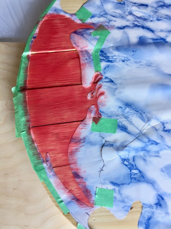 Once dry, replace the middle section, then peel up the bird. Dry brush with red paint.