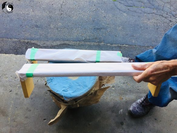 When spraying a round piece, like this frame, it’s helpful to build wood risers to spray on. The risers are elevated to allow the piece to dry (which you’ll see further ahead).